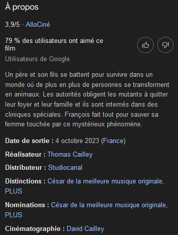 Un mot sur le film, le Règne Animal (Criaduras asombrozas) de 2023 avec en tête d’affiche Romain Duris, un film de science fiction à la française, qui m’a globalement bien plu.
