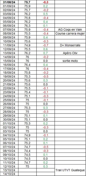 Un classique tu le sais bien: je rentre en été, souvent assez maigre. Je ne me refuse rein en France! Je rentre en Colombie fin août avec plusieurs (souvent 7 ou 8) kilos en plus. Et ce pratiquement toutes les années depuis 2016. Et aux alentours du 1er décembre de chaque année, je fais l’analyse de poids des 3 mois, ici pour la version de la rentrée 2024.