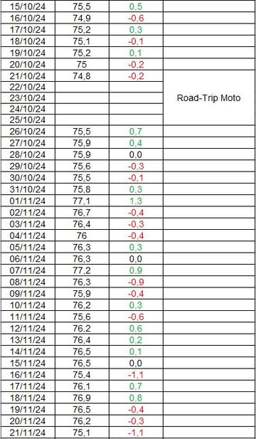 Suivis du tableau récapitulant les pesées quotidiennes! Avec évidemment quelques manques, dus aux voyages!