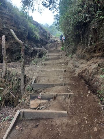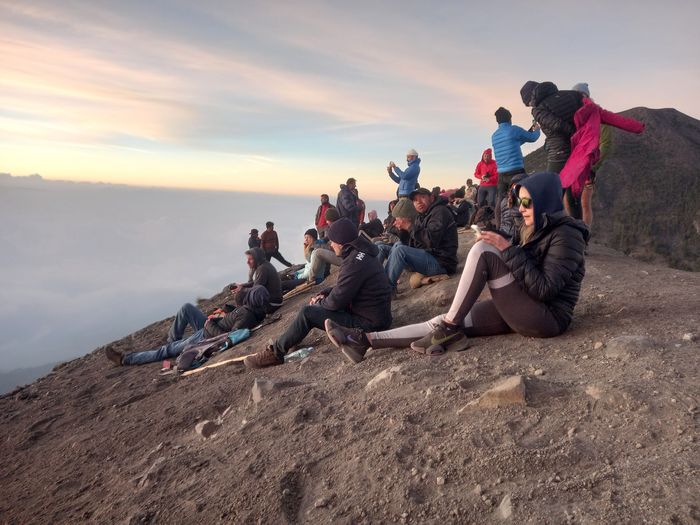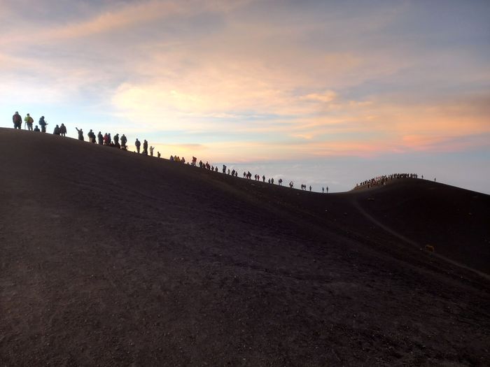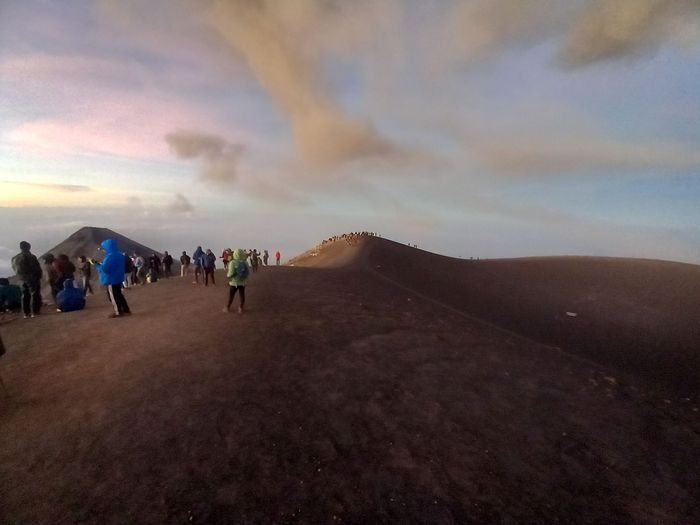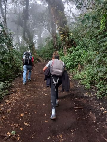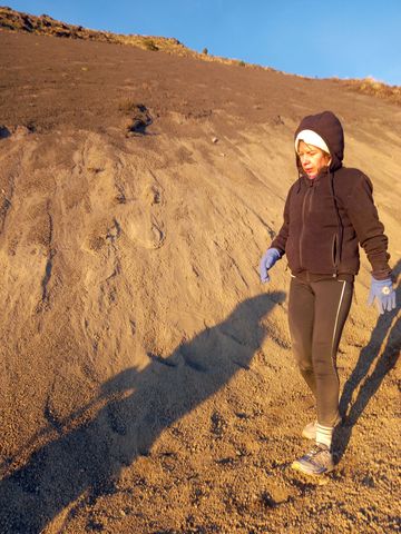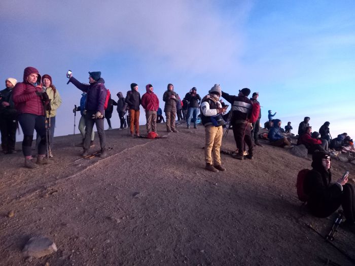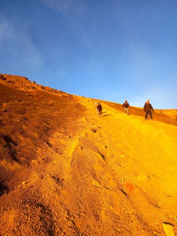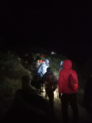 Équipement (nous aussi profitons de l’offre bonnet-gants-veste), mais aussi les 4 repas à emporter et les 3 litres d’eau par personne (qui nous surprennent un peu j’avoue, en alourdissant fortement nos sacèà-dos), petit-déj, vue sur l’objectif et en route (à 10h). C’est rude, car l’élévation est rapide, la chaleur brutale et surtout les sentiers pour croiser les groupes qui redescendent de leur nuit là-haut, n’est pas du tout assez large!