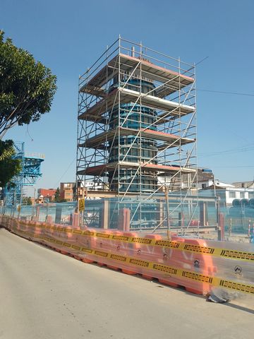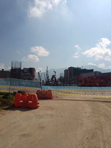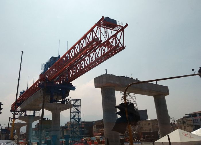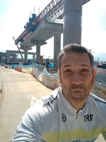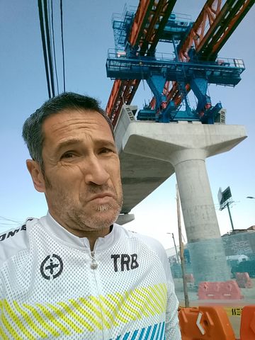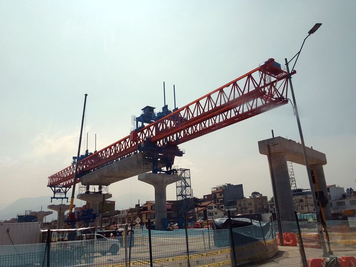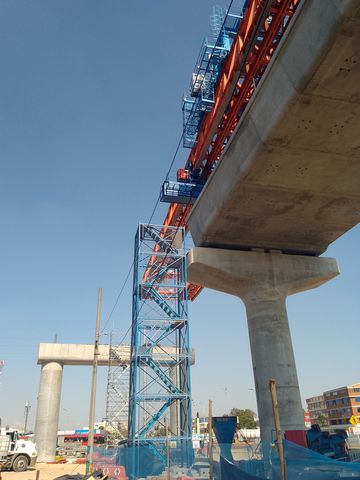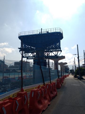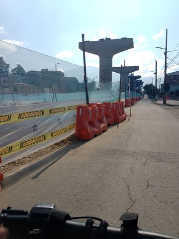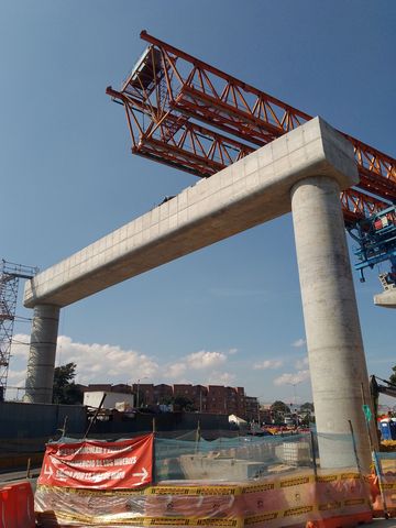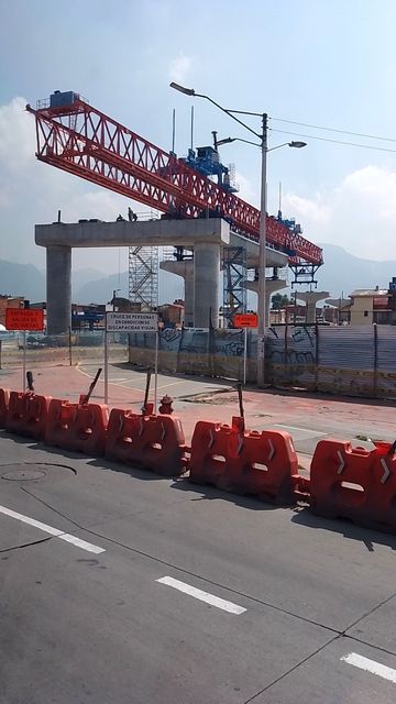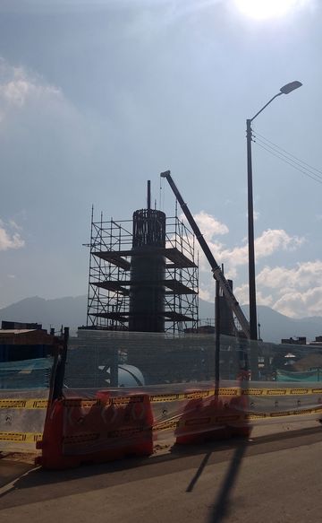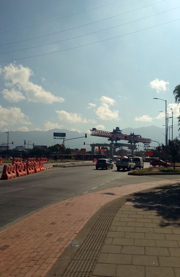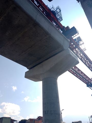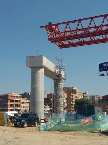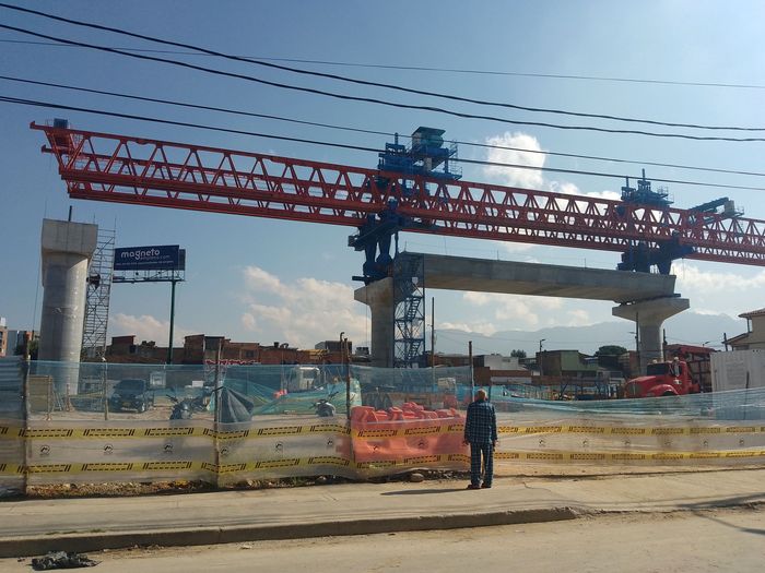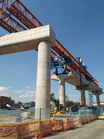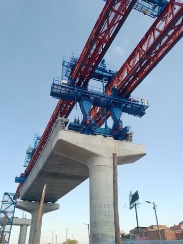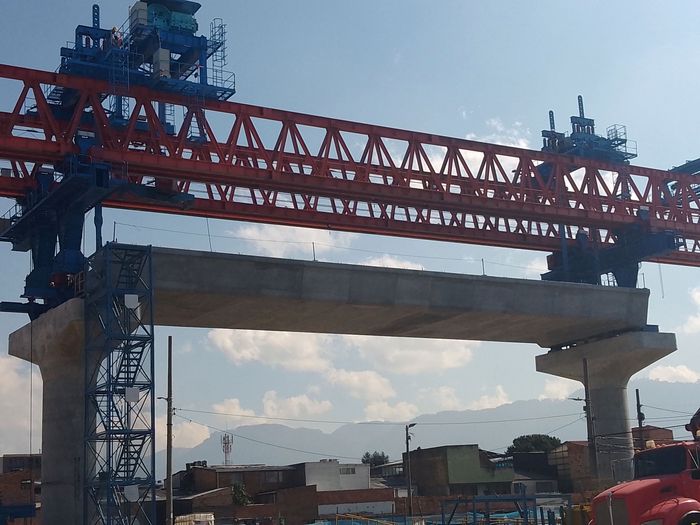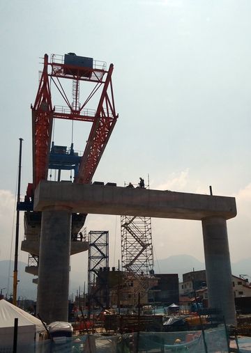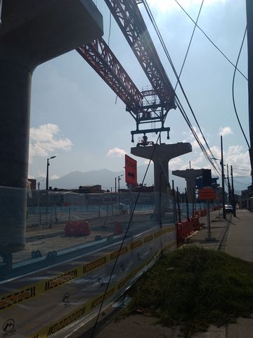 Je prends quelques minutes pour observer l’installation sous tous les angles: les piliers, ce n’est plus si rares, ils poussent comme des champignons sur l’Avenida Caracas. Mais le tablier, c’est le premier posé que je vois, et la machine permetant sa pose, m’intrigue et m’impressionne!