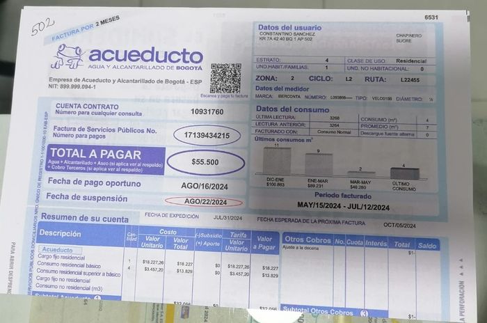 Avec ces 4 mètres cubes consommés entre le 15 mai et le 12 juillet, qui se rapprochent de ma conso normale (seulement 2m3 lors de laphase de transition) la facture se monte à 55.500 pesos soit environ 12.50€.