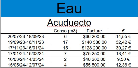 Pour finir la série, après les communications et l’énergie, voici le bilan de mon année de consommation et donc de factures d’eau! Qui n’arrivent que tous les 2 mois et c’est donc grâce à Whatsapp mais surtout Lucero, que j’ai eu la dernière en date à régler avant ce jour! Exactement comme l’an passé alors que j’ai cependant changé d’appart!