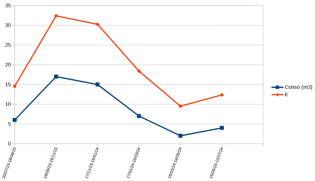 Et tu remarqueras que cette année, ma consommation moyenne et donc le montant de facture que j’ai à régler tous les 2 mois a pas mal varié…. A part l’augmentation des prix, comme partout et surtout la coupure obligatoire une fois par semaine, je n’ai pas d’explication.