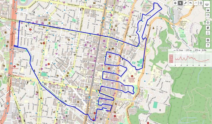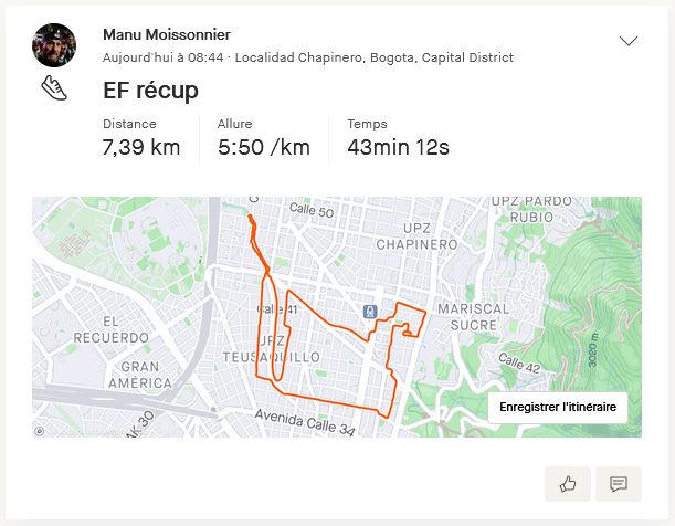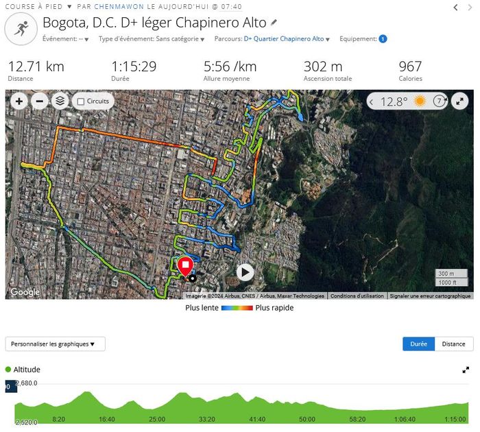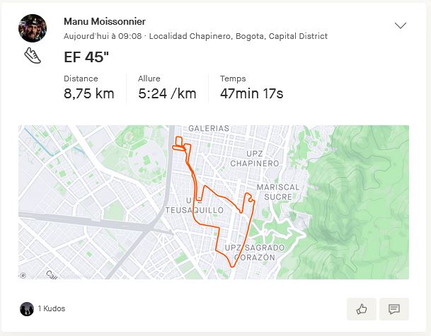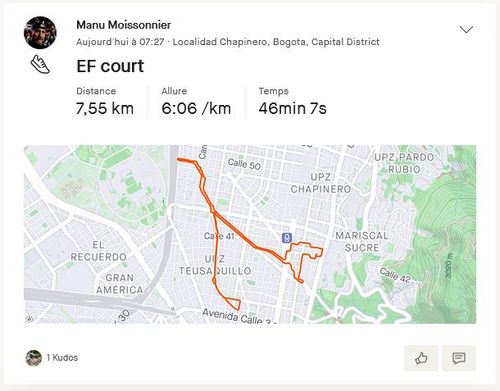 Après j’ai bien compris que pour rester assidu à cette pratique, il fallait que je m’amuse! J’ai donc profité de la fermeture du Parque Nacional, et mes pistes de D+ pour explorer les possibilités (moindres) des hauteurs de mon quartier Chapinero, soit Chapinero Alto. En préparant même un circuit avec VisuGPX… en l’important dans ma montre via Garmin Connect et en le suivant depuis le poignet!