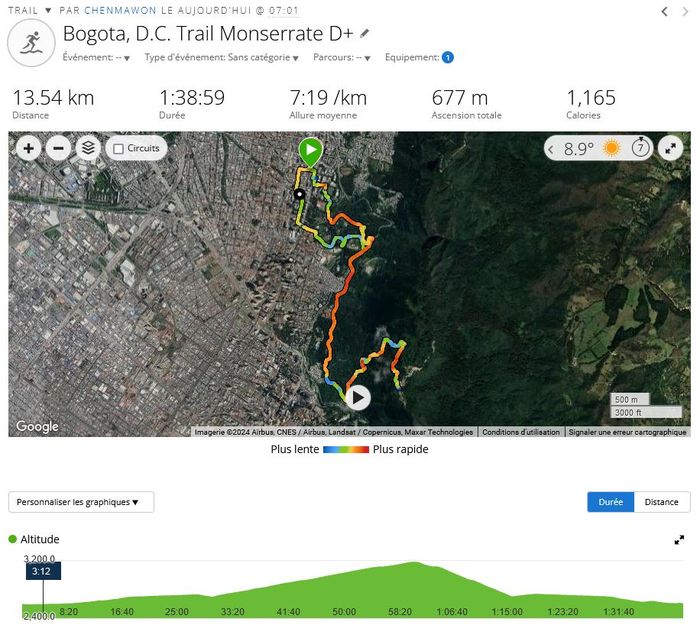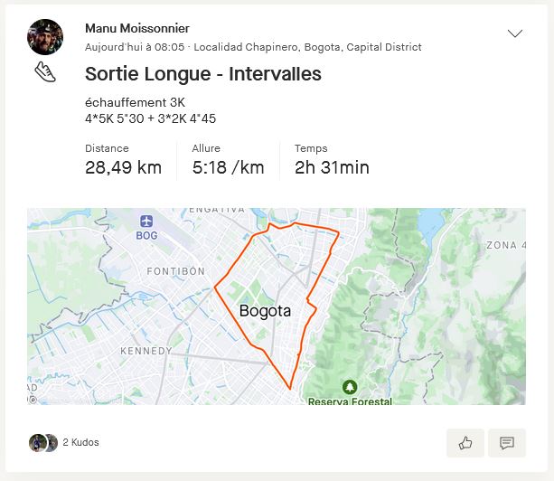 Puis il y a eu la grosse séance de D+ à Monserrate. Que tu as déjà visualisée dans cet article. Mais 28km dimanche, 16 mercredi, le physique lâche! Quand tu vieillis c’est dans la tête qu’il faut être solide et ne pas faire n’importe quoi! Donc le reste de la semaine je calme un peu, pour voir si cette douleur derrière le genou est tenace…. Jeudi, juste un petit footing de récupération. Et enfin, le dimanche, ce fameux entraînement collectif moins important pour le physique que pour le moral!