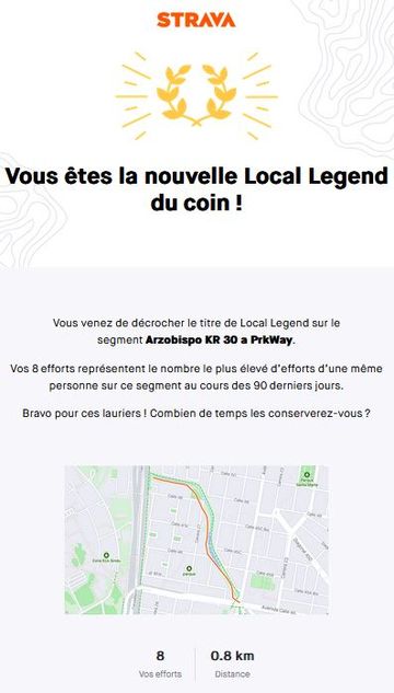 Des tests sur la cadence de course et la longueur de foulée, qui me font devenir Local Legend du Rio Azorbispo (cela signifie juste que je cours souvent sur cette portion enregistrée dans Starva)….