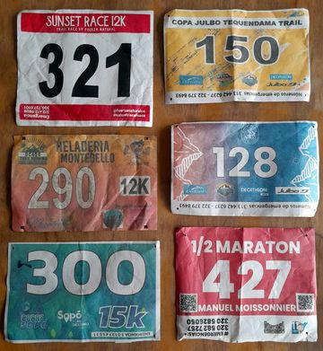 Une belle collection de dossards (même celui de la Sunset Race que j’avais récupéré la veille, avant d’être malade)!