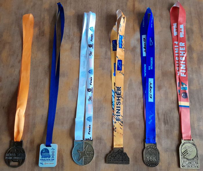 Et une encore plus belle collection de médailles! Il semblerait que les colombiens soient de grands enfants, et pas une seule course qui ne distribue pas de médaille de finisher (les français, c’est la même chose chez nous?):