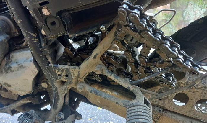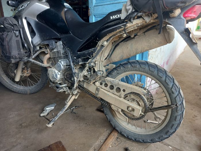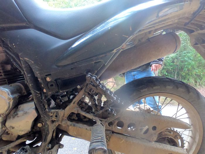 Résultats, 15 km de descente en roue libre, chaîne encore en place et maintenue en l’air…. et quelques hectomètres de poussée de moto à midi, en plein cagnard!!