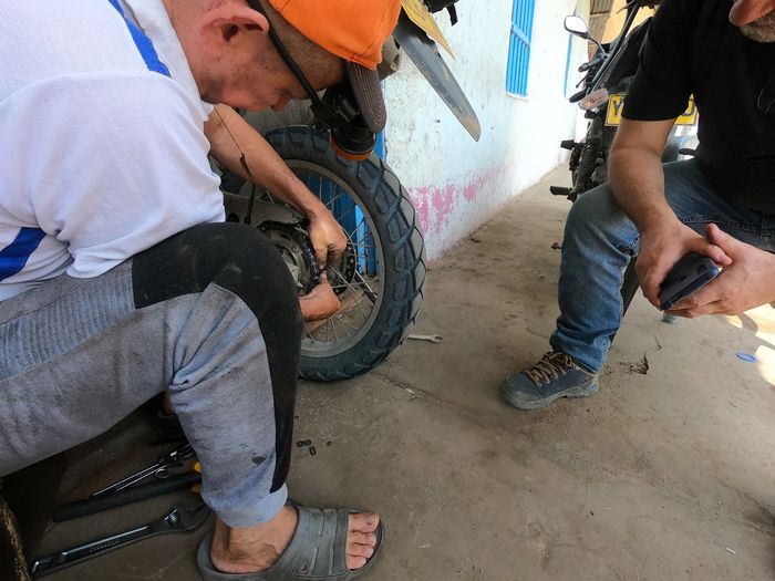 Un graissage et un réglage de tension au petits oignons plus tard, nous reprenions la route en ayant perdu seulement 1h50 et 25.000 pesos (5€) ….