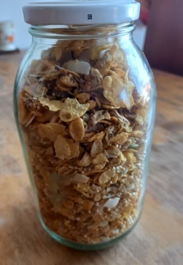D’abord j’ai changé de fournisseur de céréales, que je ne mange pas du tout le matin mais que j’ajoute de temps en temps au yaourt. Moins chères (sûrement car elles ne viennent pas dans un beau bocal en verre, celui sur la photo étant de la récup’) et toutes aussi bonnes.