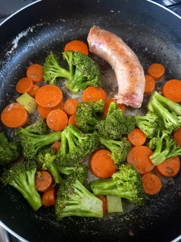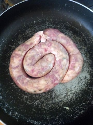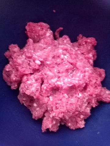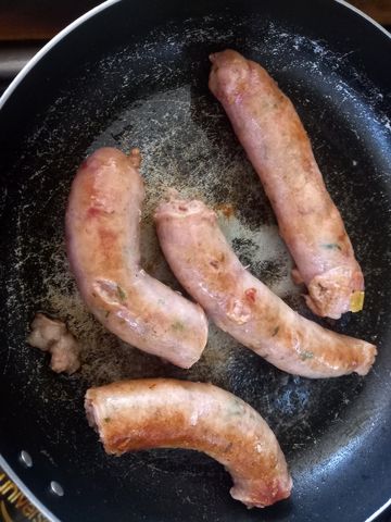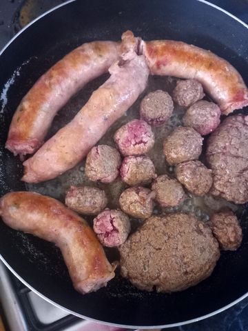 De la viande hachée de bonne qualité, avec juste la bonne dose de gras! Que j’ai pré-cuisiné en steaks ou boulettes. Oui dans la même poêle que la saucisse, histoire de minimiser la logistique vaisselle!