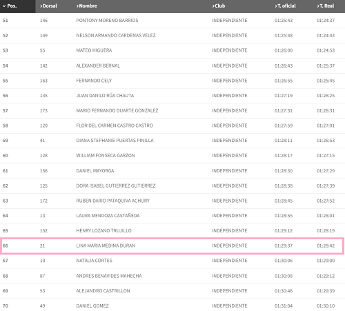 Soit, pour 4:46′ du kilomètre, 12 secondes moins bien, par kilomètre, par rapport au semi du Casanare. L’explication, outre peut-être la fatigue accumulée, est simple: épreuve courue à 2750m d’altitude (contre 260m pour celle de la semaine antérieure). Avec 140m de D+, quasiment rien pour un trail, mais qui casse le rythme régulier que tu peux avoir sur le plat.