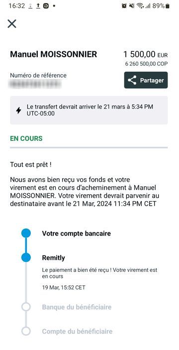 Qu’il faut alimenter, et s’envoyer à soi-même de l’argent n’est pas si simple! Perso, j’utilisais Azimo, qui fonctionnait nickel, mais qui a arrêté de gérer les particuliers pour se concentrer sur les professionnels. Je suis donc passé sur Remitly, avec quelques couacs. Comme, sans aucune raison, le refus de ma dernière tentative: l’argent était arrivé en Colombie mais n’a pas été déposé sur mon compte…