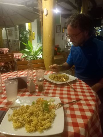 Sur le pouce à 16h après la récupération du matériel de course…. Et à base de pâtes le soir, mais au resto, la cuisine de notre hôtel n’étant pas équipé et la motivation pas au sommet…