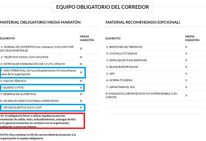 Les bagaes sont donc prêts, particulièrement « les obligatoires » donc, pour ce medio-maraton, avec quelques étrangetés! La bande souple, le sifflet, les sous, le téphone chargé avec crédit…. mais surtout l’utilisation obligatoire du masque sauf durant la course!
