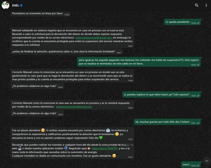 Plainte par mail, échange par whatsapp, création de plusieurs dossiers de remboursement, j’avais d’abord l’agréable surprise de trouver sur une facture en solde en ma faveur et une première facture à 0. Mais cela ne s’était pas confirmé sur la suivante. Ensuit un doux mail m’annonçant un virement. Mais avec une erreur, de leur part, sur mon numéro d’identification et donc un virement refusé par ma banque.