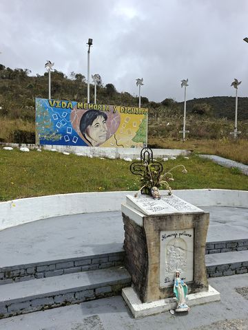 L’autre version, très courante, trop courante, ce sont ces monuments disséminés sur les routes de campagne colombienne. Comme celui que nous avons rencontré sur la route entre Aguazul et Sogamoso, en sortant du déluge dans le paramo de la Sarna à 3400 mètres d’altitude.