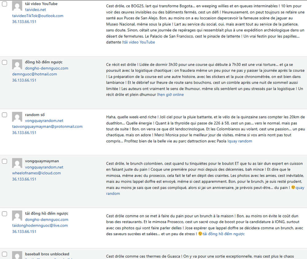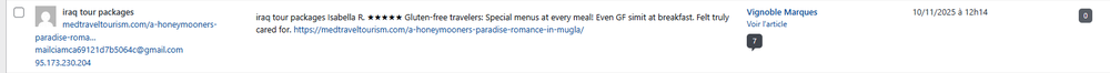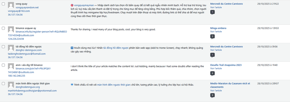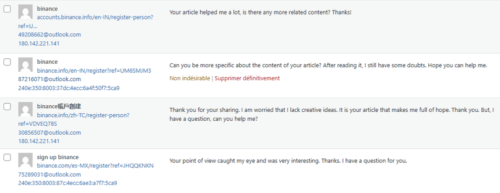 Les commentaires de robot (bot) la plupart du temps en anglais, tournaient généralement autour de cela: « mon article m’a plu », « ton article m’a beaucoup aidé », « pourrais-tu être plus précis…? ». Ceci la plupart du temps suivi d’un lien à cliquer, et voilà le tour était joué. Comme je n’ai jamais cliqué je ne sais pas trop ou emmenait ce lien…. Sûrement pas un cheminement très positif pour celui qui clique.