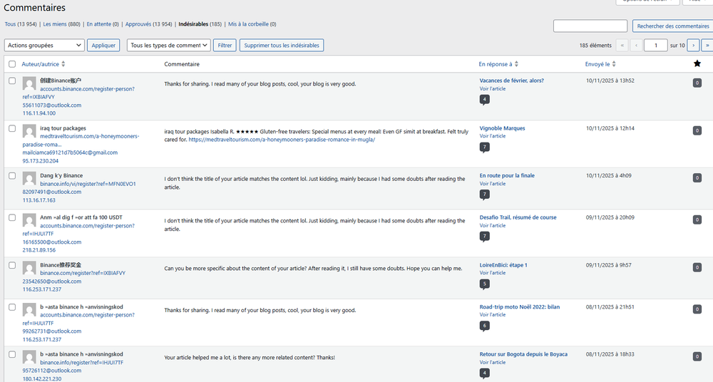 Commentaires que je sélectionne et que j’envoie dans la boîte des indésirables (que je vide de temps en temps). Car oui, pour les plus habitués d’entre-vous, les commentaires sont automatiquement publié. Pour tous les autres, émanant d’inconnus, ils attendent ma validation manuelle.