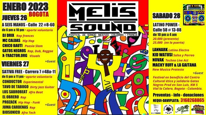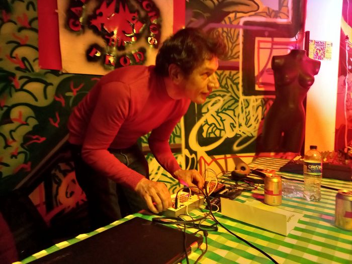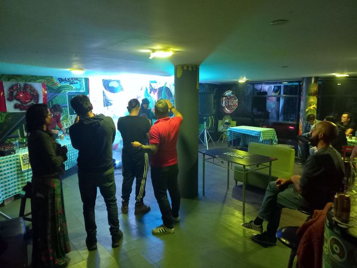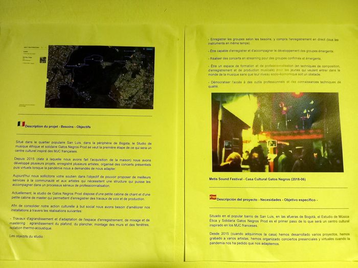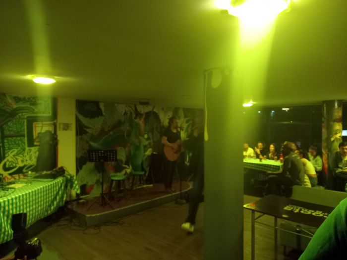 Mais un nouveau, Vincent, s’y met à son tour: responsable informatique du lycée, c’est bien évidemment vers du bidouillage électronique qu’il s’est tourné, à base de petites machines! Et vendredi soir (27 janvier), il jouait pour la première fois en public. Et pour la bonne cause, une collecte de fonds pour Juanita, une maman d’élèves et intervenante au lycée et son mari, qui possèdent et animent un studio de musique dans un quartier populaire dans la montagne, San Luis (celui dont j’avais accompagné des élèves en France il y a très longtemps)!
