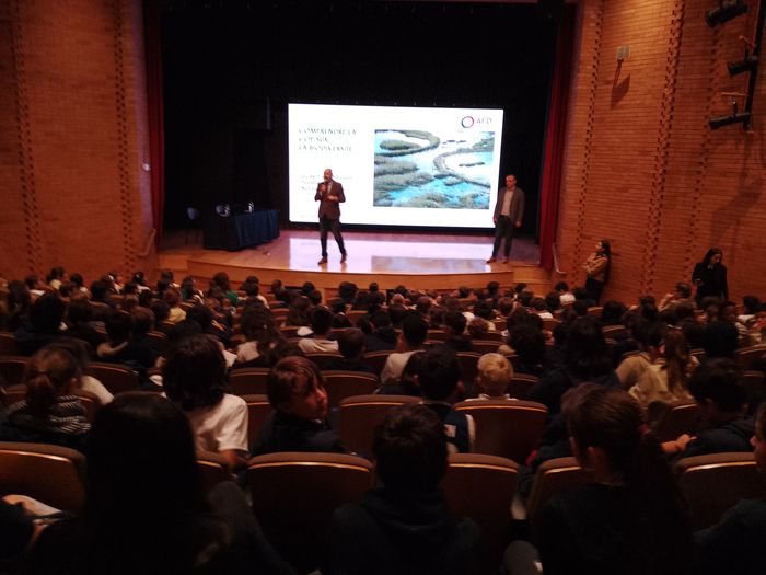 Nous recevons le directeur de l’AFD, Agence Francaise de Développement et une spécialiste terrain de cette même agence, pour nous raconter, à un niveau plus adapté aux primaires et collège, comment cela se passe concrètement, quels étaient les objectifs et quels accords furent négocier. Dynamique, participatif et bien résumé, du beau travail pour un non spécialiste de la pédagogie! Et un beau succès pour Monica et moi, avec un auditorium rempli (10 classes plus les éco-délégués). Ainsi que l’ouverture de la conférence par le Proviseur en personne!