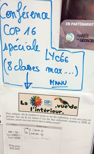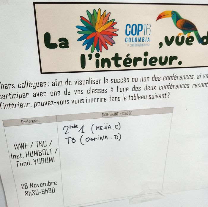Même si malheureusement trop proche de la rentrée – et en pleines vacances de Toussaint – pour y associer des projets concrets (21 octobre-1er novembre 2024), nous avons tenté, ma collègue du primaire Monica et moi, de proposer aux élèves un retour à postériori, avec des conférences (2) de personnes y ayant participé, pour avoir une idée de la COP16 de Cali vue de l’intérieur.