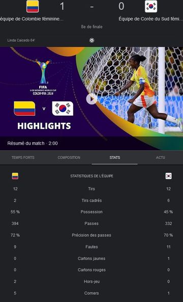 Pendant ce temps le stade a explosé 2 fois, lorsque la Colombie dans l’autre match a marquée, puis s’est qualifiée. MAis ce ne fut pas facile visiblement (12 tirs de chaque côté, 6 cadrés pour les coréeennes).