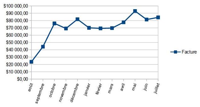 Conso là encore régulière, sauf (et je n’ai pas compris) en octobre (où j’étais pourtant sur place). Et un coût mensuel toujours inférieur à 7€ (au taux de change du mois correspondant évidemment).