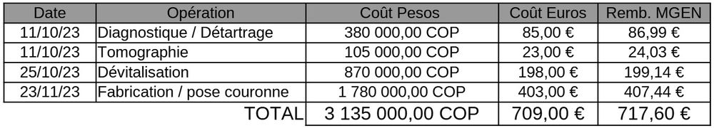 Première remarque, l’écart de remboursement en ma faveur est du aux taux de change je pense. Mais parfois c’est dans l’autre sens. Ensuite, je ne suis absolument pas un spécialiste, mais les remboursements couvrent 100% de mes dépenses. Enfin j’ai l’impression que se faire poser une couronne en Colombie est nettement moins onéreux qu’en France.