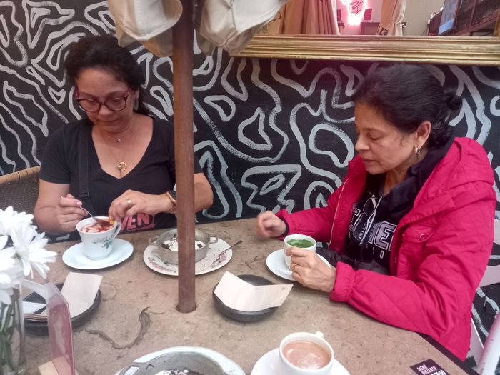 Haïti(-Colombie): je te disais dans la dernière version de la rubrique que je reverrais sûrement cette année scolaire, mon amie Alba Lucia, car celle-ci tentait d’organiser un voyage scolaire pour ces 4e-3e ici à Bogota. Et bien je l’ai recroisée encore plus rapidement qu’espéré! J’ai mangé un petit dessert à Gula avec les soeurs Sanchez!