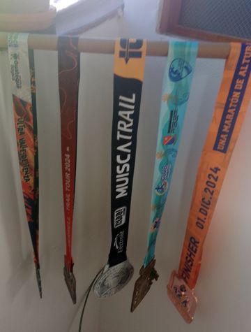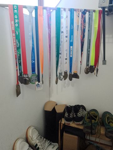 A noter également l’aménagement d’un nouveau stand « médailles », l’autre atteignant sa capacité maximale. Celui-ci étant exposé, j’ai choisi les plus représentatives (CCR2024 42K, podium de UTVT 32K, Vuelta a San Andres ou enfin Maraton de Bogota).