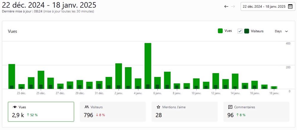 Voilà donc pour cette longue quinzaine….. racontée ce dimanche 19 janvier 2025! En espérant que ce soit assez complet pour toi!