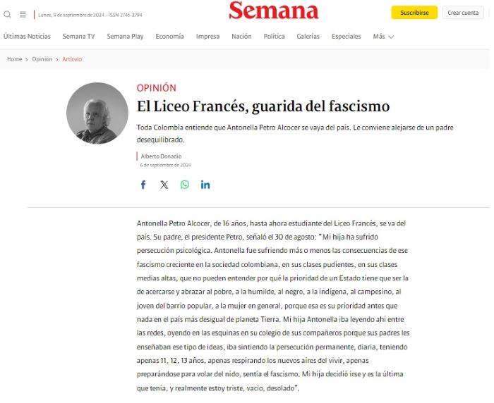 J’ai hésité d’en faire un article complet….. puis j’ai senti que cela me dépassait! J’ai aussi hésité pour savoir dans quelle rubrique de ce post placer cette info! Mais comme il en va à la fois de mon lycée mais aussi de la politique intérieur de la Colombie, je crois qu’ici est sa place. Nous scolarisons depuis des années, la fille du Président de la République et ce, bien avant qu’il soit élu. Depuis qu’il le fut, la situation de la gamine est compliquée: ce président n’est pas vraiment du même bord que la majorité de nos familles, et elle subit donc au quotidien des comportement spas toujours constructifs (façon light de le dire… non?). Son père a donc décidé de la retirer en fin d’année dernière et de l’envoyer étudier à l’étranger. Le tout en étant un peu brutal dans ses propos envers notre institution ou les gens en faisant partie. Sauf que, les 2 se manquaient trop, à vivre si éloignés, et 2 semaines après le rentrée revoilà la jeune fille, de retour en classe de première. Autant te dire que la presse d’opposition s’en est donné à cœur joie…