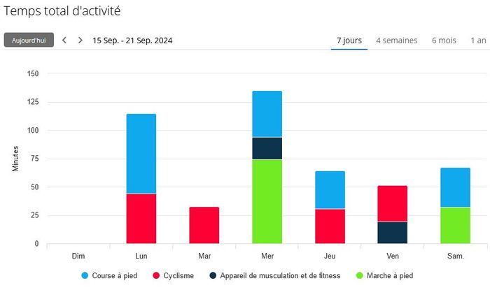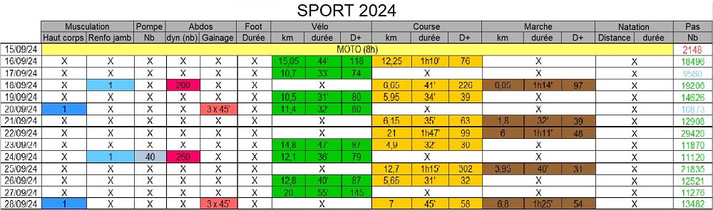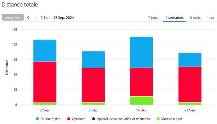Sinon évidemment ça court (toujours tu m’intéresses). Comme un bilan d’entraînement arrive bientôt, je te fais juste un récap des temps d’activités sur ces dernière semaines ainsi que les distances parcourues dans les différents sports sur ce mois de septembre!