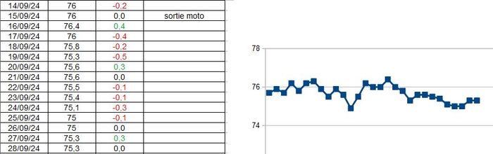 Là, absent de la dernière mouture des nouvelles en vrac, je peux me permettre de faire un point rapide sur le retour au poids de forme, espéré pour le 1er décembre (entre 72 et 73 kg). Et bien nous en sommes (samedi 28 au matin) à 75,3 et tu remarqueras que cela ne bouge pas vraiment!!!