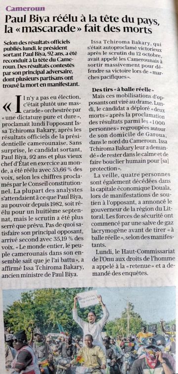 Alors pas vraiment: un article français sur un de mes postes précédents. Biya réélu président du Cameroun. Quand je pense que je le voyais mourir dans les 3 années suivant mon départ en …2013!