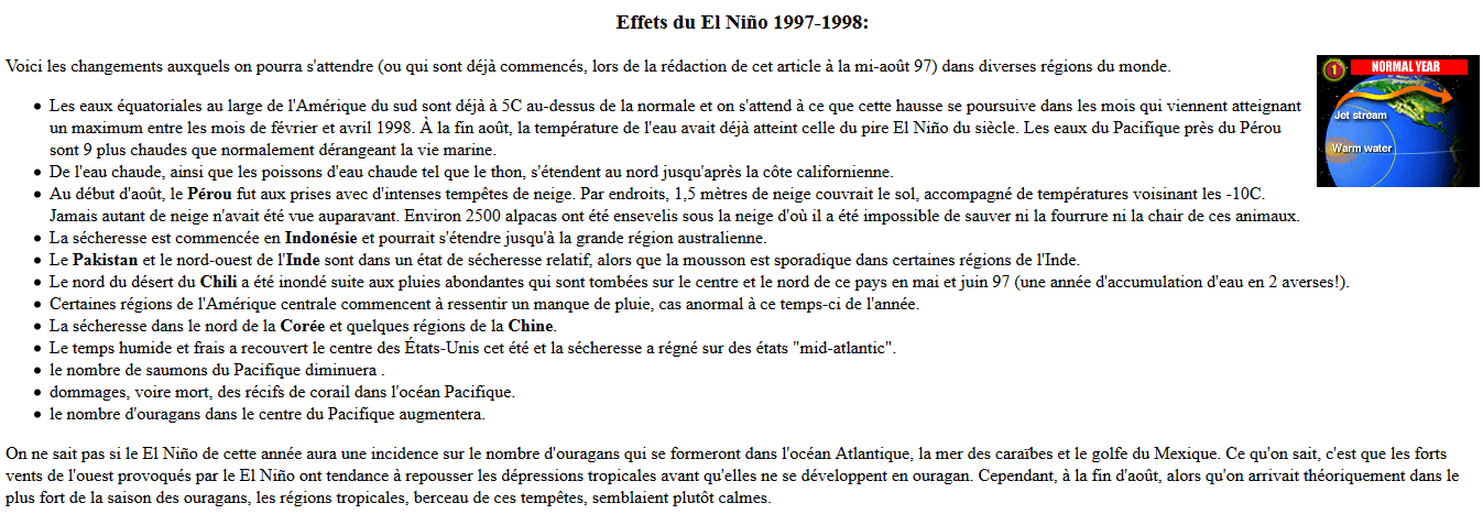 L’épisode le plus violent a été El Niño 1998 (la, lala, lala, lalalalalal, lala, lala….) et j’ai retrouver cette perle dans les archives du Net (un article de mi 1997, qui je te rappelle était encore un Internent en plein développement):