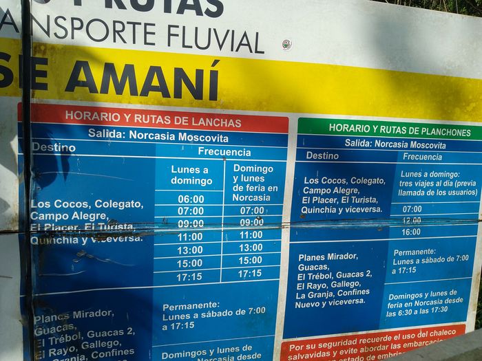 Arrivé en bas, tu découvres un vrai réseau de transport, entre lanchas de passager et même « platas », sorte de min-ferry plateau, pouvant transporter un véhicule et sûrement quelques têtes de bétails ou surtout de mules! Avec circuits et horaires (mais pas de prix… ni de caisse pour acheter un ticket). Ainsi que sûrement des lanchas touristiques!