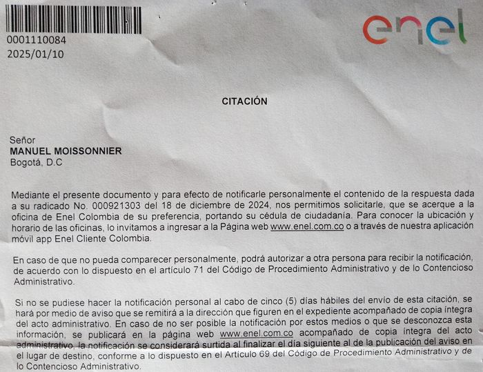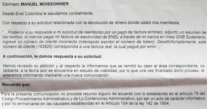 Mais avec ENEL, comme avec de nombreux autres, rien n’est jamais facile en Colombie! Rappel des faits, où je le concède une nouvelle l’erreur de départ est mienne. Enfin pour être au courant de la suite, il faut relire ce post!