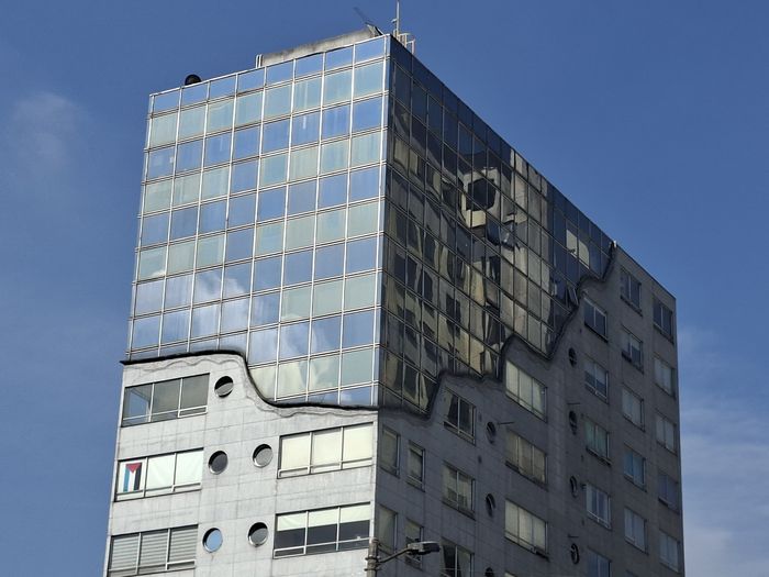 D’étranges es lignes ondulées. À la jonction entre la partie vitrée et la partie en béton, une courbe irrégulière traverse la façade, comme une vague figée dans le temps. Ce détail accentue l’impression d’un immeuble en mouvement, presque organique.