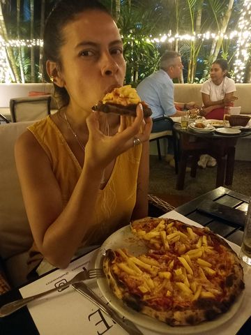 Oui, oui tu as bien vu, la Miss fan de l’Italie a opté pour une pizza aux frites!! Apparemment un classique en Italie, mais que par décence elle n’avait jamais osé commander.