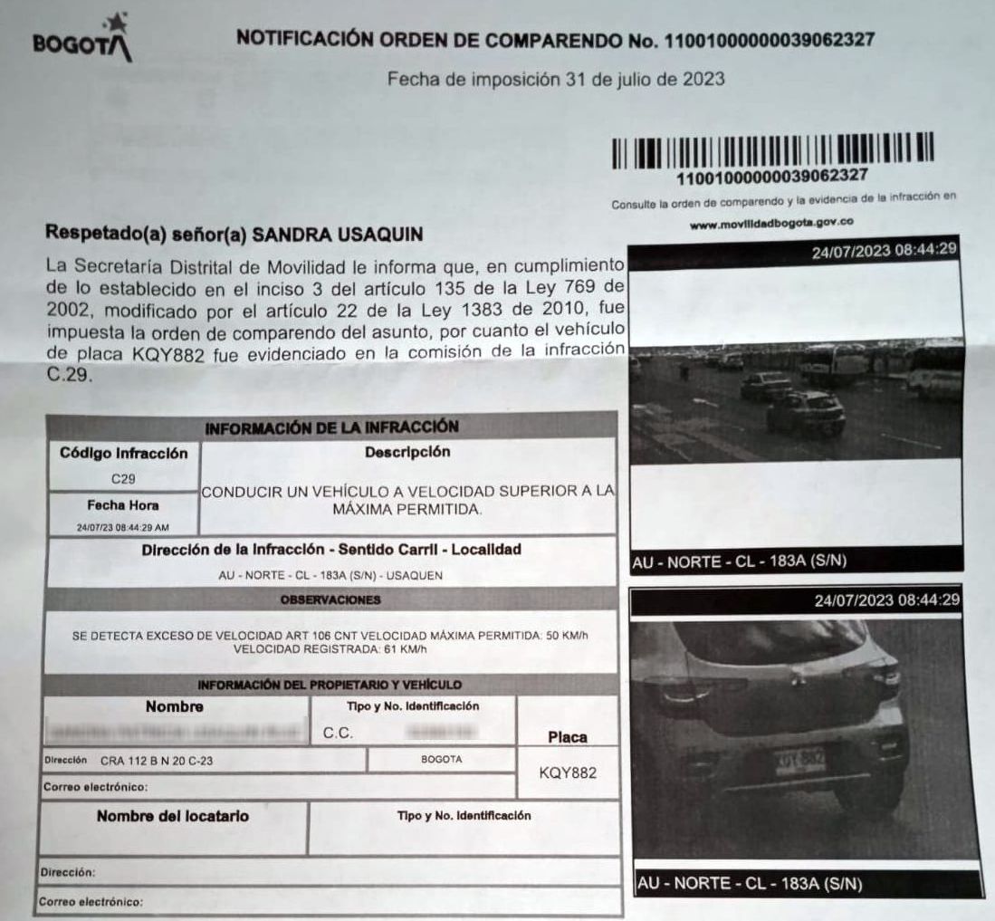 D’ailleurs c’est sur l’Autopista Norte, avant de sortir de la ville, au niveau de la Calle 183 que j’ai été flashé à …61 km/h au lieu de….. 50!! Oui, une autoroute limitée à 50…. Avec photos à l’appui, incluses dans le document!