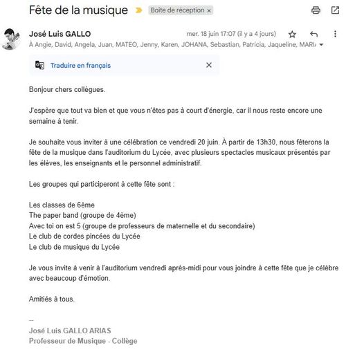 Mais très sympa, avec des chants par les 6e, travaillés en cours de musique durant l’année scolaire. En espagnol bien sur, en français mais aussi en anglais. Et différents groupes, d’élèves de 4e, de profs ou le club musique du lycée.