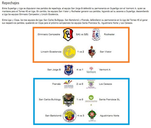 Alors au niveau des résultats de tous les repêchages (3 matchs entre SuperLiga -1ère div.- et Liga, 3 matchs entre Liga et Copa -3e div.-), notre division, l’intermédiaire donc, s’en sort très bien: 2 clubs supplémentaires montent, et les 3 du bas de classement (dont nous) se maintiennent tous!