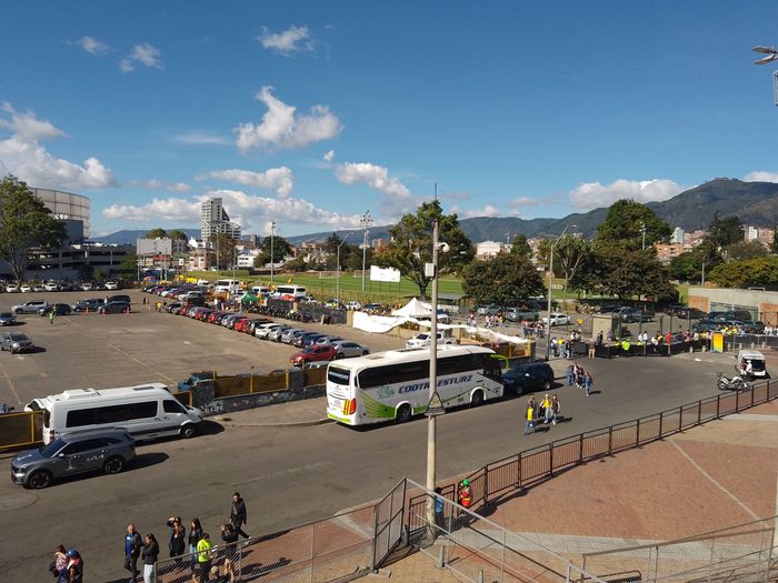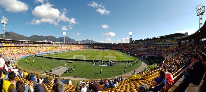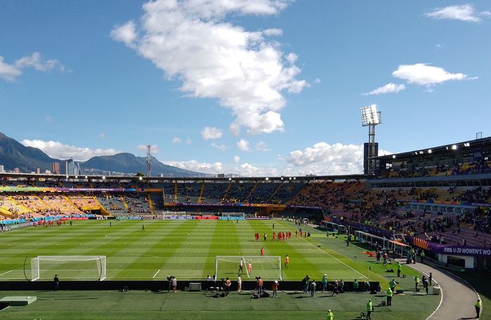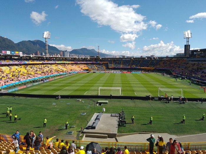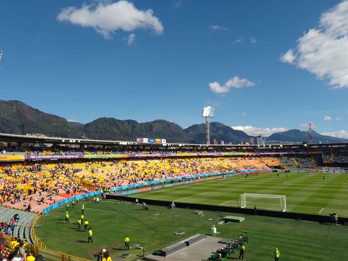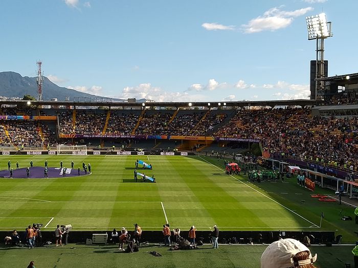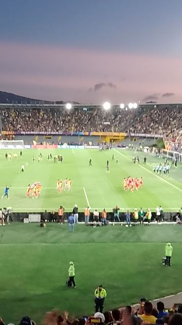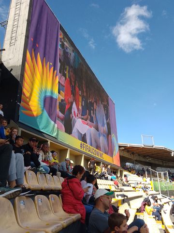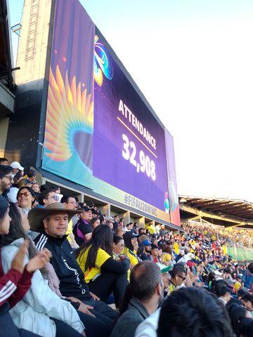 Nous regardons donc le stade se remplir petit à petit, dans une belle lumière, vue sur les montagnes et soleil haut, sans savoir quelle sera l’affluence finale! Puis les équipes rentrent s’échauffer sur le terrain.