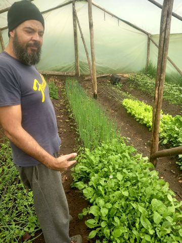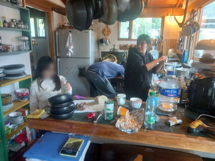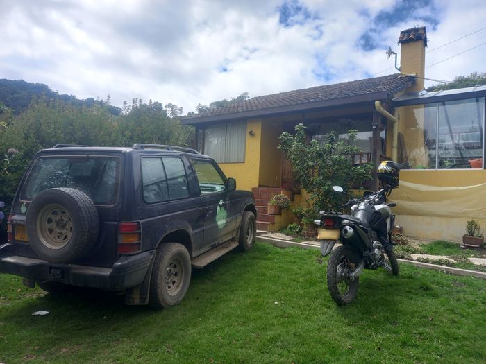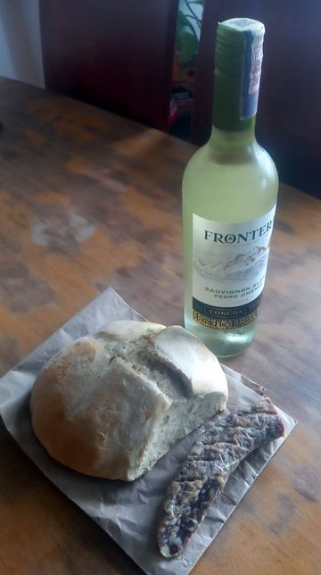 Profitant du deuxième lundi férié (hier donc) j’y suis monté, sous le soleil, à moto! Pour jeter un œil et partager un déjeuner, avec sa fille Nina et sa compagne Gina. Comme je savais qu’on allait manger local, j’ai contre-balancé avec de la bouffe de la ville( saucisson des Vargas, blanc du Chili et pain maison).