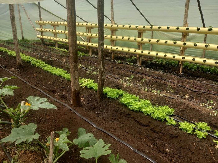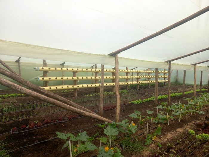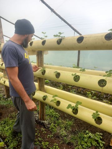 La grosse innovation technologique, ce sont les plants de fraise dans ces tubes PVC jaunes en hauteur: