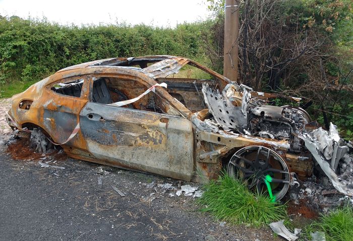 Cela commence par du « moderne », avec au bout d’un tout petit chemin (tellement petit que je dus faire demi-tour), un cabriolet Mercedes brûlé!